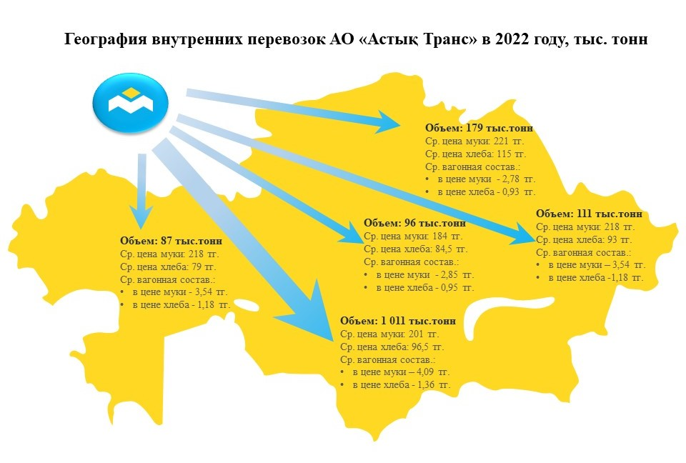 По итогам 2022 года доля АО «Астық Транс» во внутренних перевозках зерна составила 76%. Согласно оперативным данным, более 1 млн. тонн зерновых грузов было доставлено в южные регионы страны для переработки в муку и далее в хлеб.